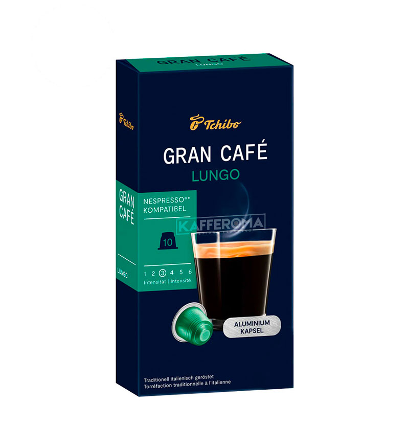 Descoperiți noul Lungo Tchibo Gran Café, disponibil în capsule de aluminiu compatibile cu Nespresso®*. Cu un caracter echilibrat intens și o aromă de prăjire unică, acest Lungo este prăjit în stil tradițional italian și este un amestec armonios de cafele Arabica selectate din America de Sud și America Centrală. Capsulele sunt sigilate în mod proaspăt aromat, prevenind pătrunderea oxigenului, a luminii și a umidității, și oferă o alternativă mai ecologică decât alte capsule compatibile cu Nespresso®