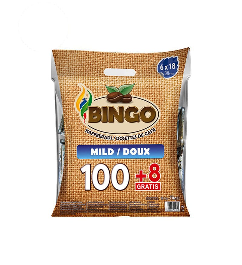 În pachetul Bingo Mild vei găsi 6 pungi, fiecare conținând 18 paduri, oferindu-ți astfel un total de 108 bucăți. Potrivit pentru toate espresoarele Philips Senseo cu paduri cu diametrul de 62 mm.