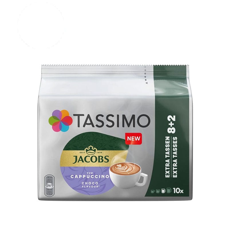 Ambalajul conține 10 capsule Tassimo Jacobs Cappuccino Choco, perfecte pentru iubitorii de cappuccino cu ciocolată – o băutură caldă, aromată și reconfortantă, care aduce o notă dulce de rafinament în fiecare zi.
