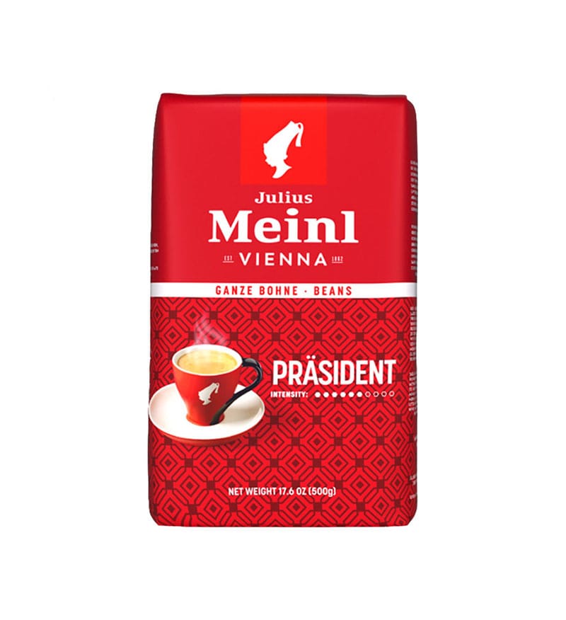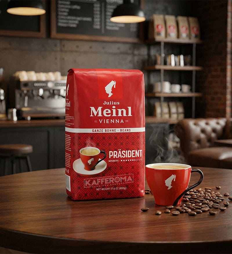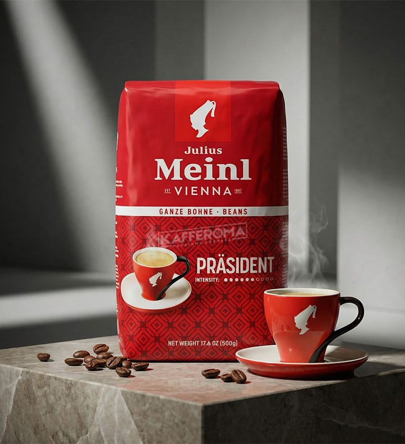 Julius Meinl Präsident este o emblemă a rafinamentului vienez, fiind un amestec de cafea boabe de o calitate excepțională, creat special pentru a onora tradiția de peste 160 de ani a casei Julius Meinl în selecția și prăjirea boabelor nobile. Această compoziție premium se distinge printr-un profil senzorial bogat și extrem de armonios, oferind o experiență gustativă echilibrată ce amintește de atmosfera distinsă a cafenelelor istorice din Viena, unde fiecare ceașcă este pregătită cu o atenție desăvârșită la detalii.