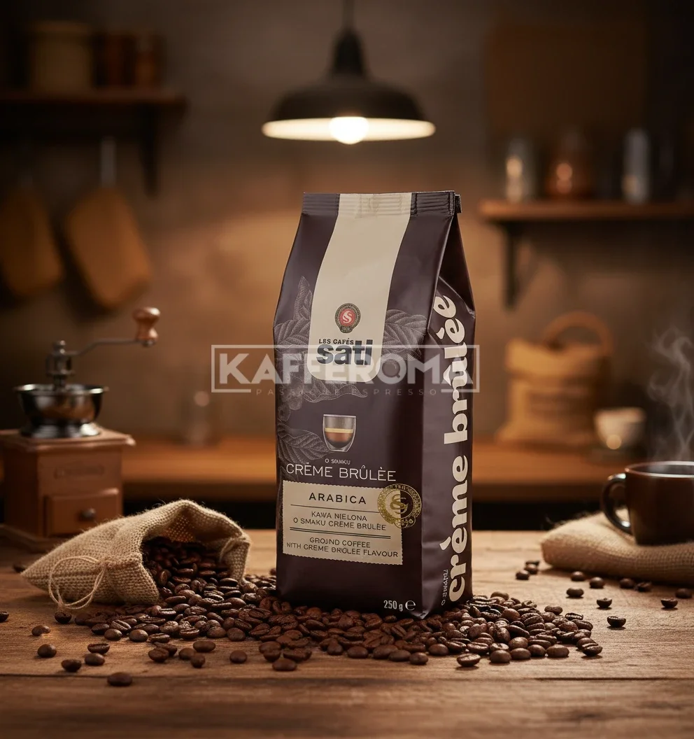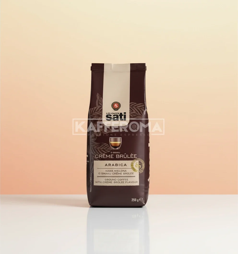 Cafeaua măcinată Café Sati Crème Brûlée transformă fiecare ceașcă de cafea într-un desert elegant și rafinat. Aceasta combină boabe de cafea Arabica de înaltă calitate cu aroma delicată și seducătoare a celebrului desert francez.